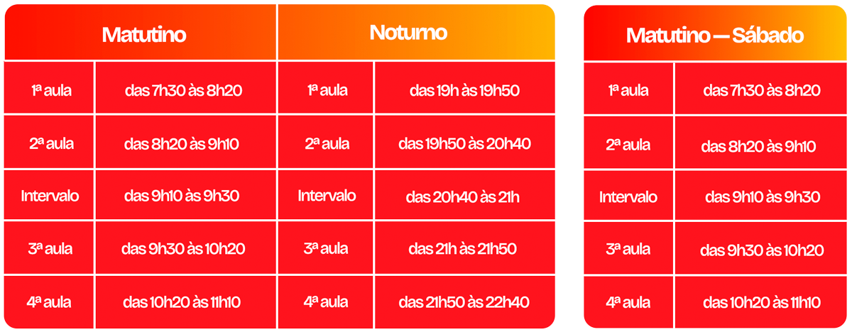 As provas deverão iniciar-se conforme horário de início da aula na respectiva disciplina, sendo a tolerância máxima para entrada na sala de até 50 minutos do início da aplicação da prova, quando poderá ser autorizada a saída de alunos que tiverem concluído a avaliação. Não será permitida a entrada de alunos após transcorridos 50 minutos do horário de início das avaliações ou após a saída de alunos da sala. As disciplinas ministradas nos dois períodos subsequentes (4 aulas) deverão iniciar as provas no início da 1ª aula, sendo às 7h30, no matutino e às 19h, no noturno, não sendo permitida a entrada de alunos após o intervalo ou após transcorridos 50 minutos do início da avaliação.